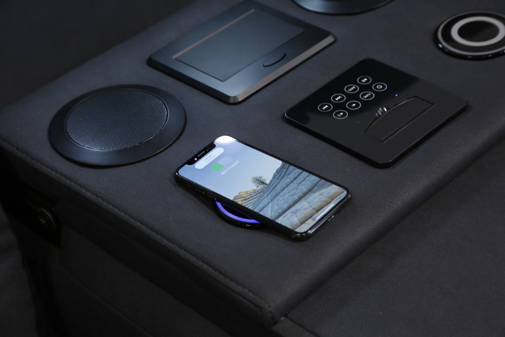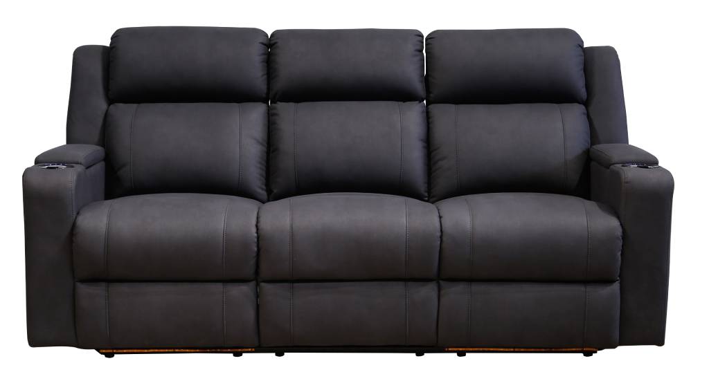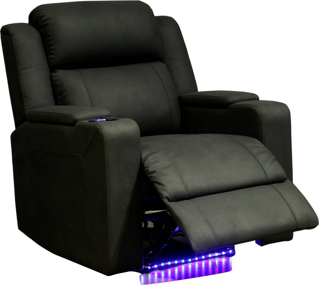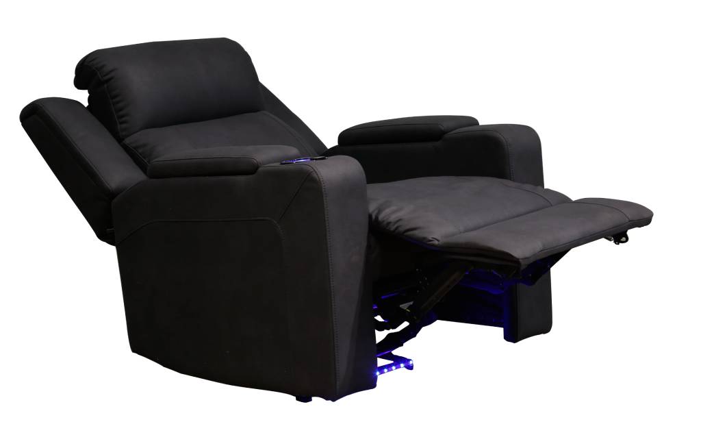 Home Theatre features a dual-motor electric recliner system, allowing independent adjustment of the headrest and recliner for personalised comfort. Ambient blue base lighting enhances your media room atmosphere. Includes smart technology features, built-in Bluetooth audio with subwoofer, wireless charging, USB ports, and integrated controls to create the complete entertainment experience.